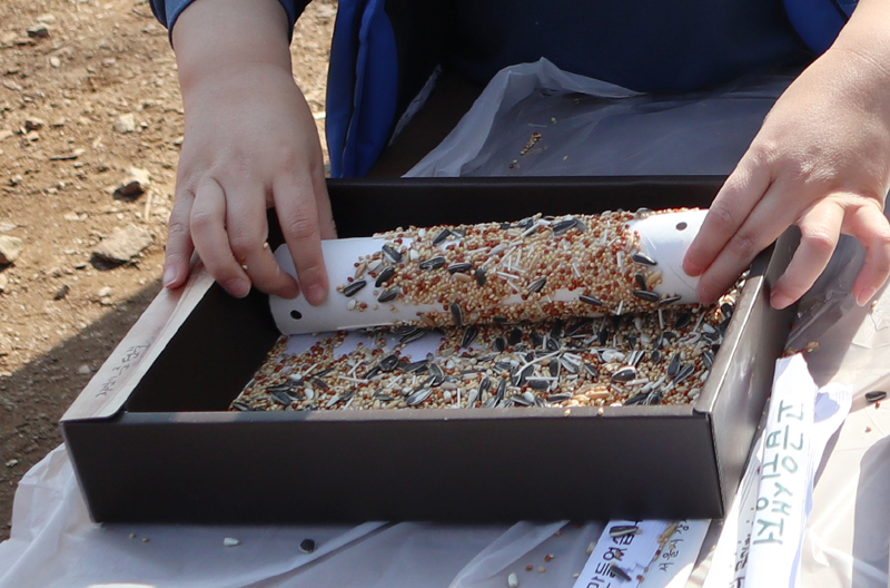 새 모이를 사서 휴지심에 붙이고 나무에 매달아 주고 왔는데요.